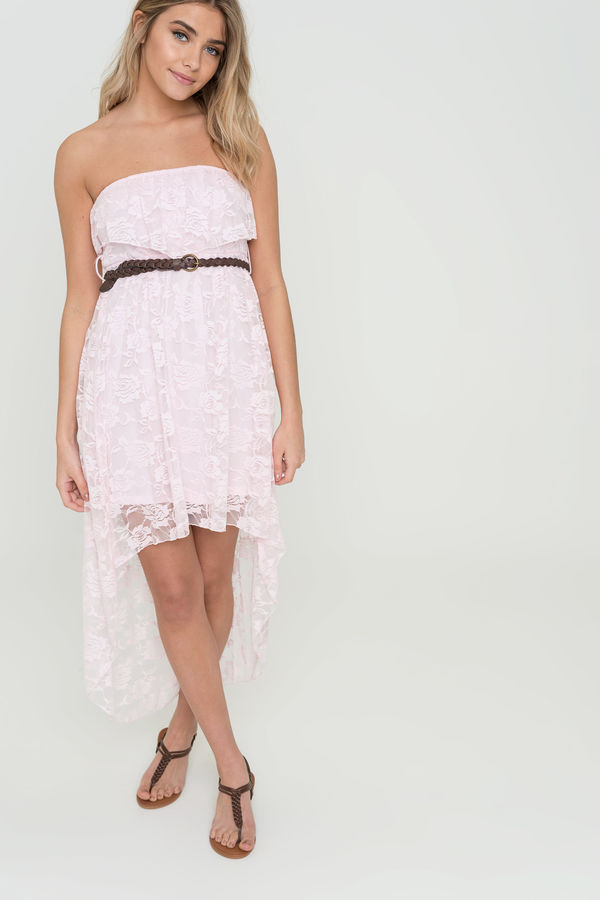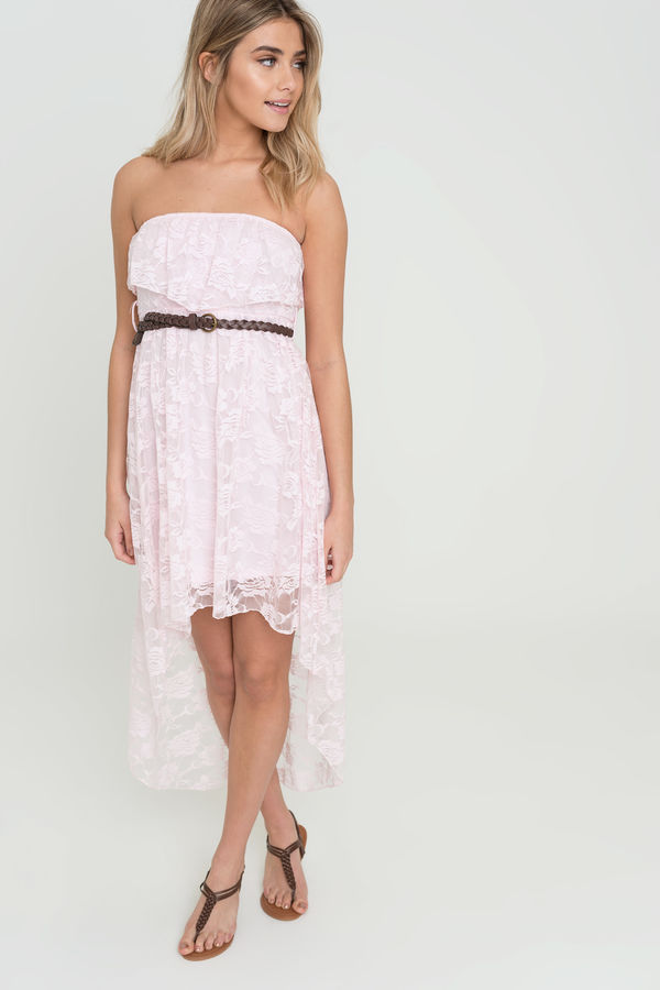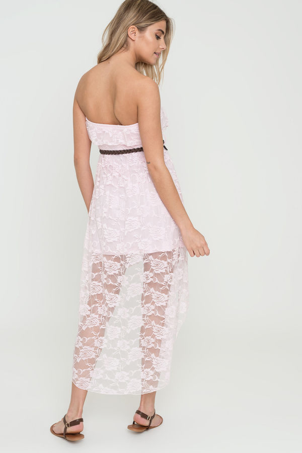 Strapless maxi dress. Elastic collar. Removable faux leather belt. Empire waist. Full lining. Dip hem. Lace fabric. 95% nylon, 5% spandex. Lining: 100% polyester. Model is wearing size S.
