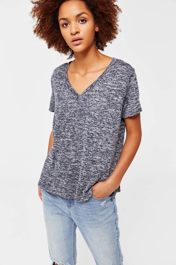 Knit t-shirt. Deep V-neck. Short sleeves. Loose fit. 48% viscose, 48% polyester, 4% spandex. Model is wearing size S.