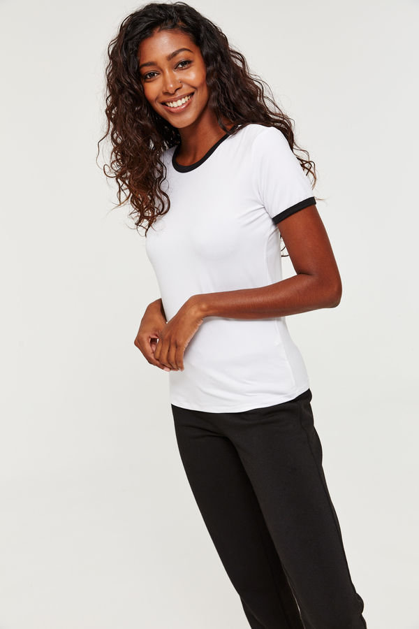 Exclusive piece from our Basic collection. Super soft knitted t-shirt. Round collar. Short sleeves. Striped borders. 92% polyester, 8% spandex. Model is wearing size S.