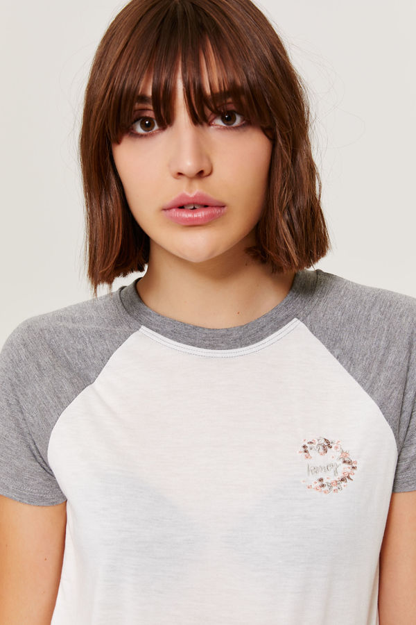 Knitted t-shirt. Crew neck. Short sleeves. Floral embroidery on breast. 60% modal, 40% polyester. Model is wearing size S.