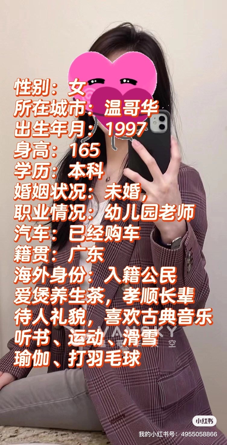 女#030:1051:温哥华,1992年,163,本科,未婚,会计,温柔有礼貌气质好