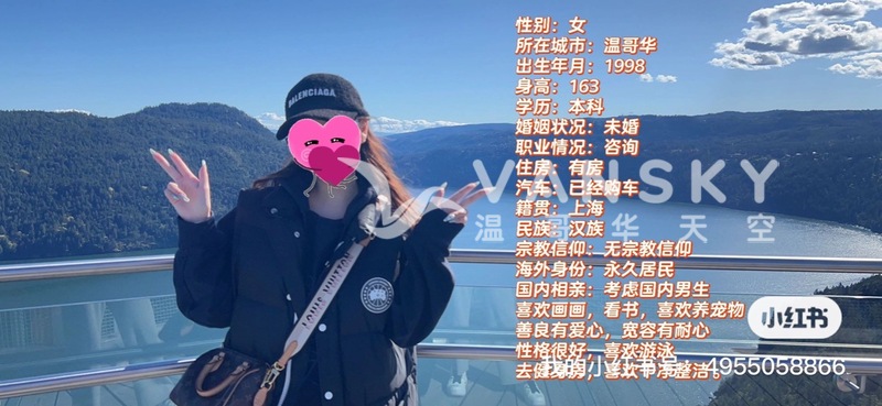 女#008:5194:温哥华,1995年,166,本科,未婚,自媒体博主,漂亮