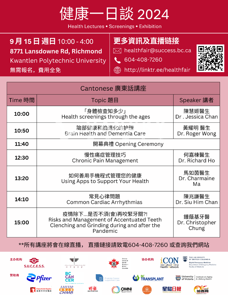 每年一度的《健康一日谈》今年将在周日9月15日上午10点至下午3点半在列治文Kwantlen Polytechnic University (昆特伦理工大学) 举行实体活动,包括健康教育讲座、健康检查、展览摊位,由中侨互助会、加华医学会及加华牙医学会联合举办,并得到安康健康网络的支持。多名资深医生、牙医以粤语和国语向公众提供最新的医学知识。无需报名,费用全免 。