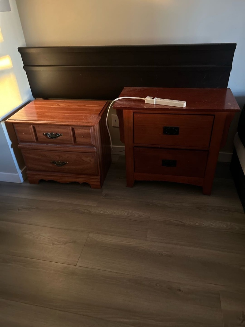 九成新Queen size双人 布艺木床架,5年前买自JYSK,包括床头床尾,两个侧板和一条支撑木板条。卖$60