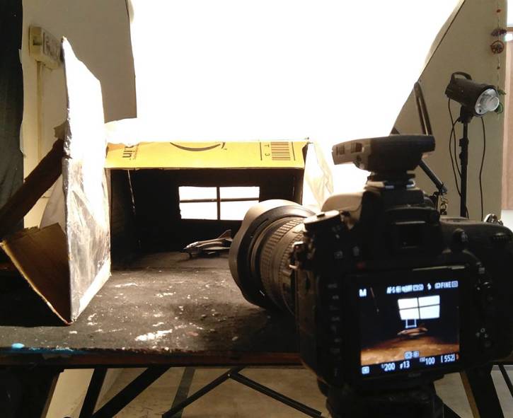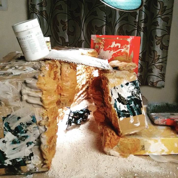 他不想使用那些道具和立体模型,希望自己动手用低成本做出好的场景,于是在创作的时候,他通常用石膏做山和岩石,然后用旧报纸做成山的形状。