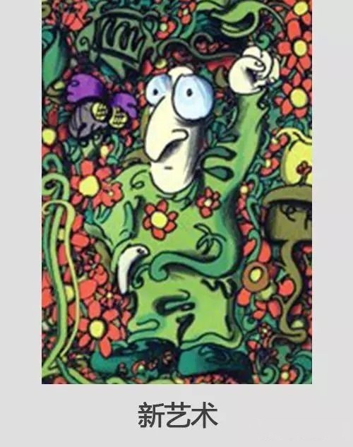 野兽派是20世纪崛起的画派,最大的特点就是色彩大胆鲜艳,笔法率直奔放,也难怪艺术评论家把它形容为“野兽”。漫画中,人物色彩鲜明,连眼球都涂成了红色,与绿色形成鲜明对比。野兽派的领军人物是法国画家马蒂斯。