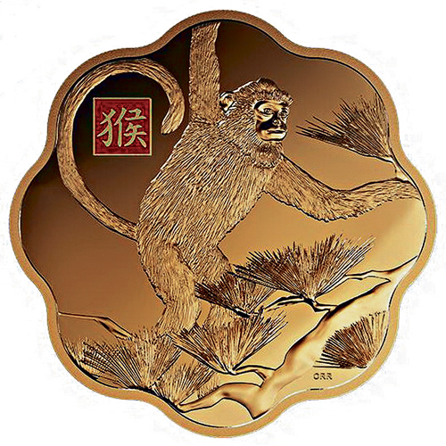 该枚金币直径120毫米,面值2,500元,币背是猴子攀松远眺图案,由Three Degrees Creative Group设计,并铸有中文「猴」字,金币正面图案是英女皇伊莉莎白二世头像及2016字样。该币每枚售价是69,000元。