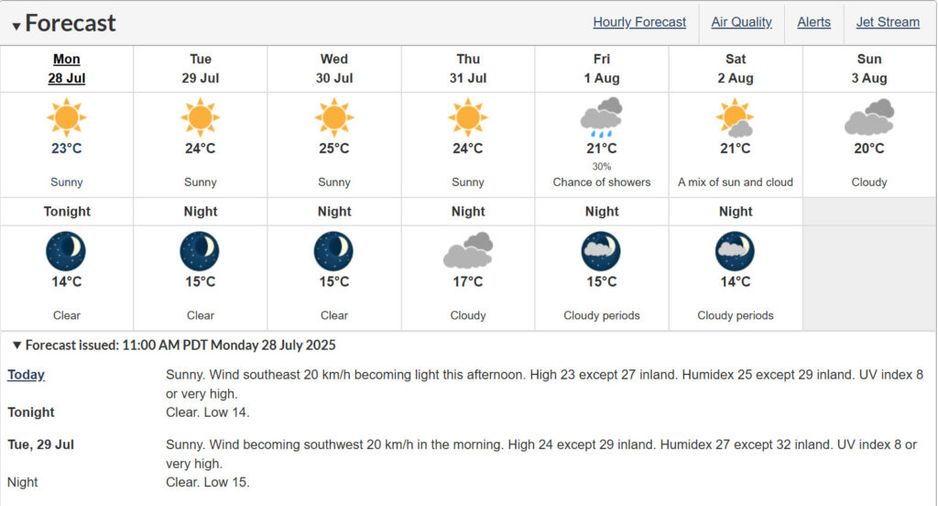 最新的天气预报显示,7月28日(周一)大温内陆地区的气温有望达到27°C,而7月29日(周二)则可能达到39°C。