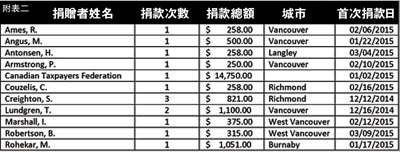 此外,不要交通税所收到逾2.7万元的捐款中,按捐款人居住城市统计,来自温市有43笔捐款,共2,036.20元、素里有24笔,共1247.20、本拿比有15笔,共646.30元、西温有11笔,共522.80元、高贵林有9笔,共416.40元、列治文10笔,共410.60元。至于捐款逾200元的有11个捐款人。