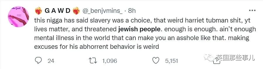 “这位老哥曾经说当奴隶是一种选择,说哈莉特·塔布曼(注:一个废奴主义者)没有解放过奴隶,说白命贵,现在,他还威胁犹太人。真是够了,世界上没有心理疾病会让你变成这样的垃圾。不要再为他的可憎行为找借口。”