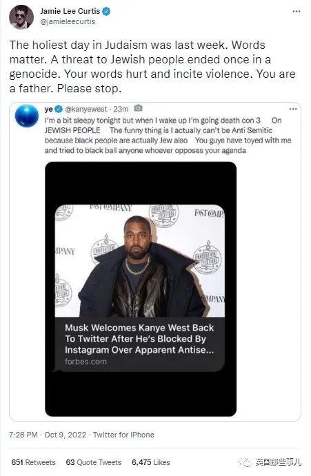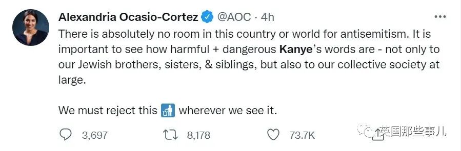 “不管是在我们国家,还是在全世界,都不会给反犹主义任何空间。我们必须清楚地看到,侃爷的言论非常危险,伤害巨大。他不光伤害了我们的犹太兄弟姐妹,还破坏了我们的社会。