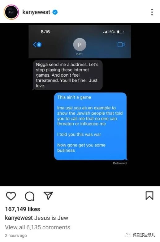也许是觉得自己的回复特别硬气,侃爷把聊天记录公开到Ins上,还写了一句意义不明的话,“耶稣是犹太人”。