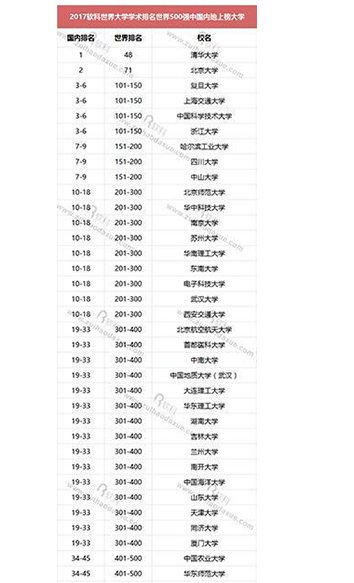 值得注意的是,四川大学进步明显,首次入围世界两百强;在200强之列的,还有哈尔滨工业大学和中山大学。而在201-300名的范围内,中国内地共有北京师范大学、华中科技大学、南京大学、苏州大学等9校在列,其中电子科技大学和武汉大学由2016年的301-400名,上升至世界第201-300名。