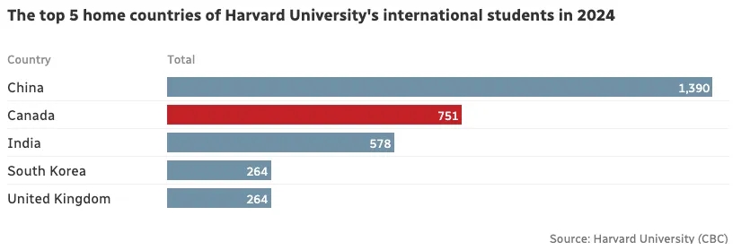 根据哈佛大学的招生简章,中国留学生人数最多,共有1390名,加拿大紧随其后,位居第二,2024年有751名学生入学。