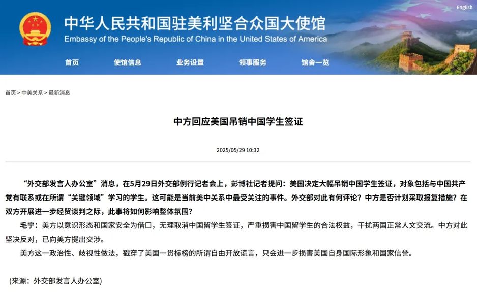 “外交部发言人办公室”消息,在5月29日外交部例行记者会上,彭博社记者提问:美国决定大幅吊销中国学生签证,对象包括与中国共产党有联系或在所谓“关键领域”学习的学生。这可能是当前美中关系中最受关注的事件。外交部对此有何评论?中方是否计划采取报复措施?在双方开展进一步经贸谈判之际,此事将如何影响整体氛围?