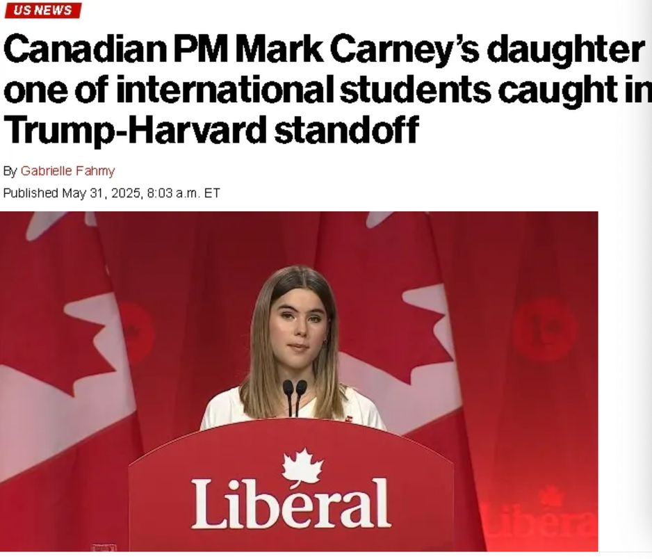 特朗普政府一周前取消了哈佛大学招收国际学生的资格,这使得目前在校的外国留学生必须转学或面临签证失效的风险,其中也包括加拿大现任总理马克·卡尼(Mark Carney)的女儿克里奥·卡尼(Cleo Carney)。