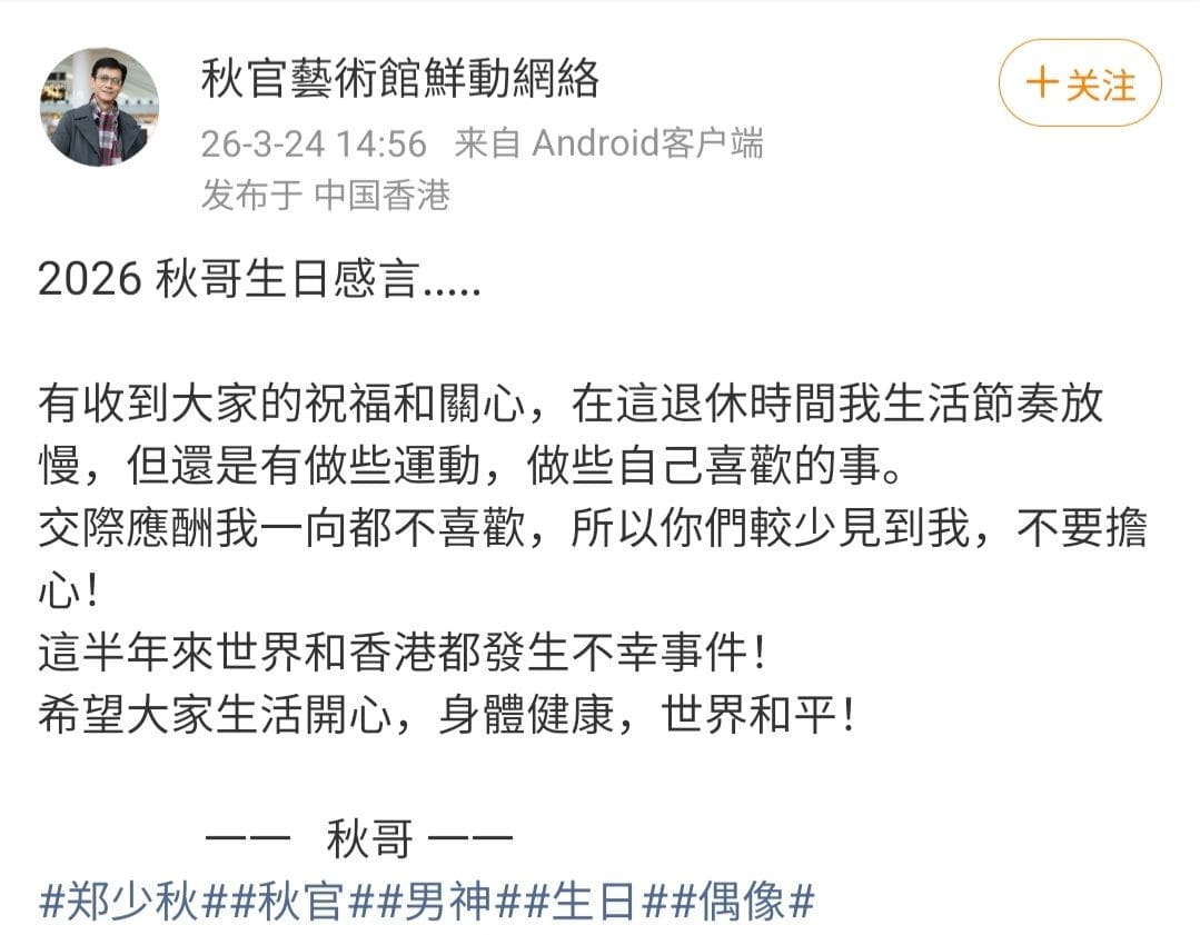 适逢郑少秋的农历生日,一个名为“秋官艺术馆鲜动网络”的微博账号发布了一则署名“秋哥”的感言,相信是郑少秋亲自向关心他的粉丝报平安。