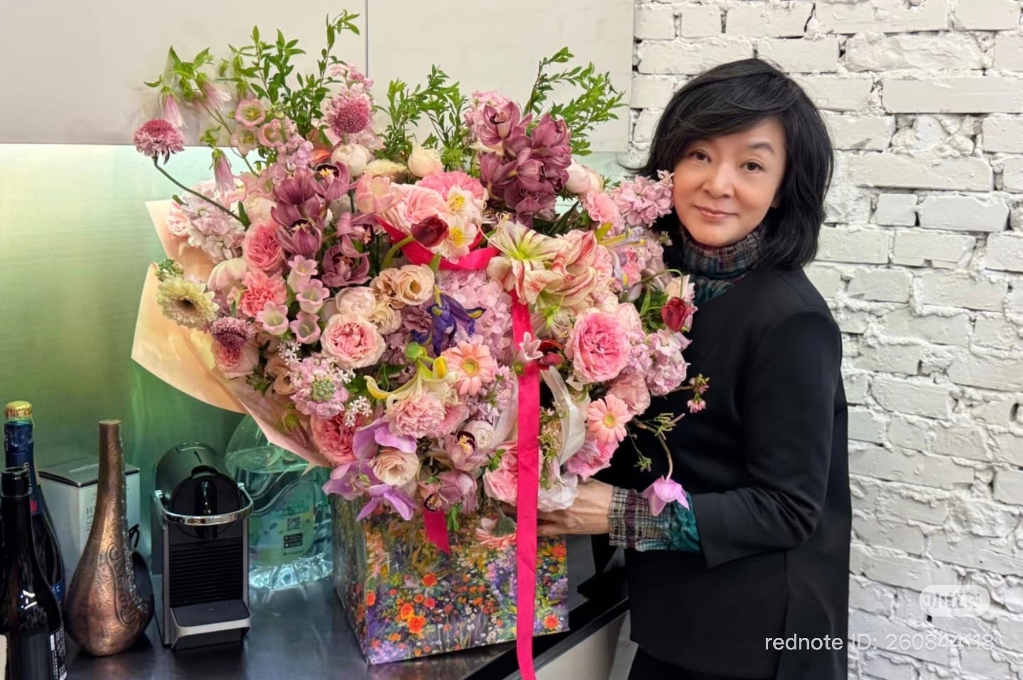 照片中,陈玉莲以一头俐落短发亮相,身穿黑色外套,整体造型简约大方,散发一贯的优雅气质。她身旁摆放着一束几乎与人同高的巨型花束,色彩缤纷,洋溢着浓厚的春日气息。
