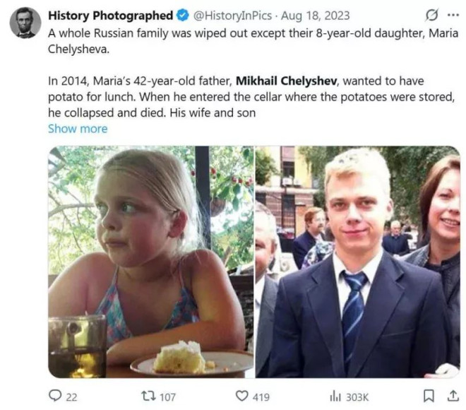 根据《每日镜报》引述俄罗斯媒体报导,当时的情况显示,8岁的玛丽亚(Maria)在家中厨房画画,父亲米哈伊尔(Mikhail Chelyshev)、母亲安娜斯塔西亚(Anastasia Chelyshev)和18岁哥哥乔治(Georgy Chelyshev)先后前往家中地下室。米哈伊尔原本下楼取用储存的马铃薯,但迟迟未返回,安娜斯塔西亚与乔治随后跟进寻找,却同样未再现身。家中68岁外婆伊拉伊达(Iraida)察觉异状后先向邻居求助,邻居抵达前外婆也下楼探查,最终亦倒在地下室内。
