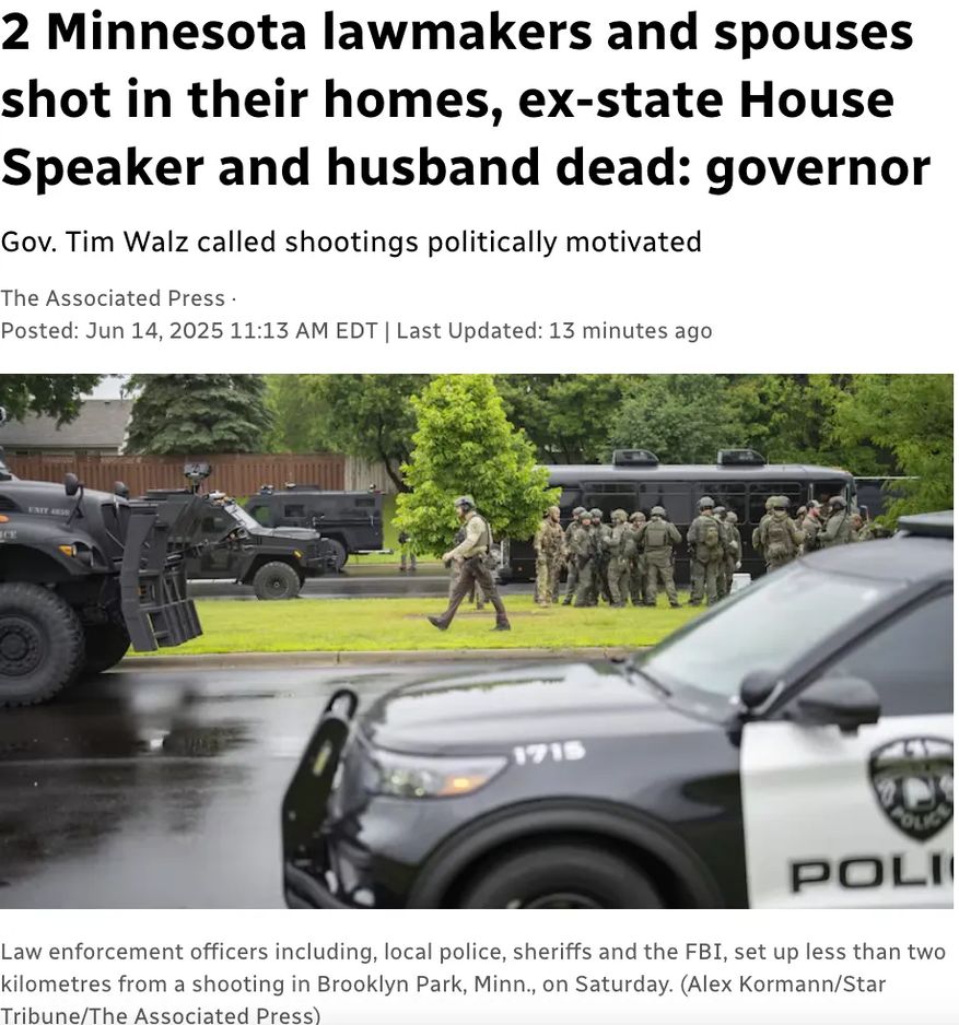 今天(6月14日)凌晨,美国明尼苏达州一名议员及其丈夫在家中被冒充警察的男子枪杀,另有一名议员及其妻子受伤,州长称此举为“有针对性的政治暴力”。