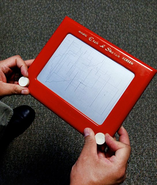 这是我们小时候拥有的最接近iPad的东西。放到现在来看是个非常低科技的画图板,只能用两个小旋钮带动铁笔在画面上画出线条。这也是一个你可以随身携带的玩具,出去郊游的时候也会带上在路上玩。