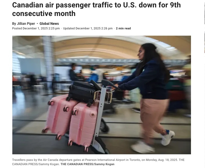 加拿大飞往美国的航空旅客数量,已经连续 第九个月出现下滑。 根据加拿大统计局最新数据,2025 年 10 月,全国航空客流总量同比上涨 4.5%,达到 500 万人次。但其中前往美国的旅客却下降了 8.9%,仅剩 120 万人次。 这一变化发生在美加贸易战持续近一年、美国总统唐纳德·特朗普多次提出将加拿大“并入美国”的背景下。 近一年以来,特朗普不断发表有关“让加拿大成为第51州”的言论。在今年 1 月被问到是否会用军事力量“吞并加拿大”时,他没有否认,只说:“不会,是经济力量。如果把人为画出来的边界去掉,北美的经济和安全都会更好。” 2 月,美国对加拿大发动贸易战,对除能源、关键矿产、钾肥外几乎所有加拿大商品加征 25% 关税;能源等则被征收 10% 的关税。 随后又继续加码,对 钢、铜、铝征收 50% 关税,对木材征收 45% 关税,对非自由贸易商品维持 25% 关税。 10 月加拿大总理 Mark Carney 访问白宫时,特朗普被问及加拿大赴美旅游减少的问题,他回应称:“这会解决的,两国之间一直有很深的感情……但我们竞争同一批生意,这就是问题。” “有个办法可以从根本上解决这个问题,非常简单。”(显然指的仍然是他那套“并州论”。) 根据美国旅游协会的估算,加拿大游客的减少是美国国际旅游收入下降 57 亿美元(美金)的主要原因。他们预计今年美国国际旅游消费将下降 3.2%。 与赴美旅客大幅下降不同,加拿大国内航空出行出现明显反弹。 10 月国内航班客流同比上涨 8.5%,达到 240 万人次。 加拿大旅游局(Destination Canada)表示,今年夏季加拿大本土旅游收入达到 近 600 亿加元,同比增长 6%,主要靠加拿大人“前所未有地选择在国内旅行”推动。 而 Ipsos 的最新民调显示,72% 的加拿大人表示特朗普的“51州”言论反而强化了他们的加拿大身份认同。