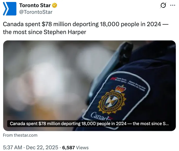 据加拿大边境服务局数据显示,加拿大在2024-2025财年花费超过7800万加元遣返了1.8万多人,创2012年哈珀时期以来最高纪录。