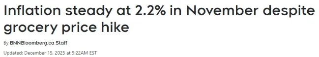 加拿大统计局(Statistics Canada)今天表示11月份整体通胀率保持稳定,但是,杂货店价格的持续上涨,仍在给消费者带来新的压力。   11月的年度通胀率为2.2%,与上月持平,略低于经济学家的预期。   图源:51记者拍摄   11月杂货价格同比上涨4.7%,高于10月的3.4%,并创下自2023年12月以来的最高水平。   加拿大统计局指出,新鲜浆果价格上涨是11月食品通胀加速的主要推动因素;与此同时,包括汤类、薯片等在内的即食食品这一大类价格也在普遍上升。   由于北美牛只存栏量下降,新鲜或冷冻牛肉价格在11月同比上涨17.7%。统计局还表示,美国关税叠加恶劣天气,对咖啡产区造成压力,使得精制咖啡价格同比大涨27.8%。   汽油价格虽然同比下降,但受炼油厂中断影响,11月环比仍上涨1.8%。   与此同时,消费者在出行成本方面则感受到了一定缓解。   统计局称,由于前往美国的加拿大人减少,旅游团价格在11月同比下降 8.2%。   旅客住宿价格同比也下降6.9%。统计局指出,这一下降在安省尤为明显,因为2024年11月,多伦多举办了泰勒·斯威夫特(Taylor Swift)的Eras Tour演唱会,抬高了去年同期的基数。   租金涨幅在11月也出现放缓,手机通信服务费用加速上涨。   11月的通胀数据公布前,加拿大央行已在上周将基准利率维持在2.25%不变。   CIBC高级经济学家Andrew Grantham周一在给客户的报告中表示,11月多项核心通胀指标有所下降,显示潜在价格压力正在一定程度上缓解。   他指出,核心通胀“仍然过高,不足以支持进一步降息”,但同时也“不足以在2026年引发加息的呼声”。   他表示:“我们仍然预计,加拿大央行将在整个明年维持隔夜利率在当前水平。”   TD高级经济学家Leslie Preston在一份报告中称,受去年12月中旬开始的GST假期影响,年度对比被扭曲,未来几个月通胀数据可能会出现一定程度的“波动”。   他表示,TD整体预计,未来一年通胀率将逐步回落,向加拿大央行2%的目标靠拢。