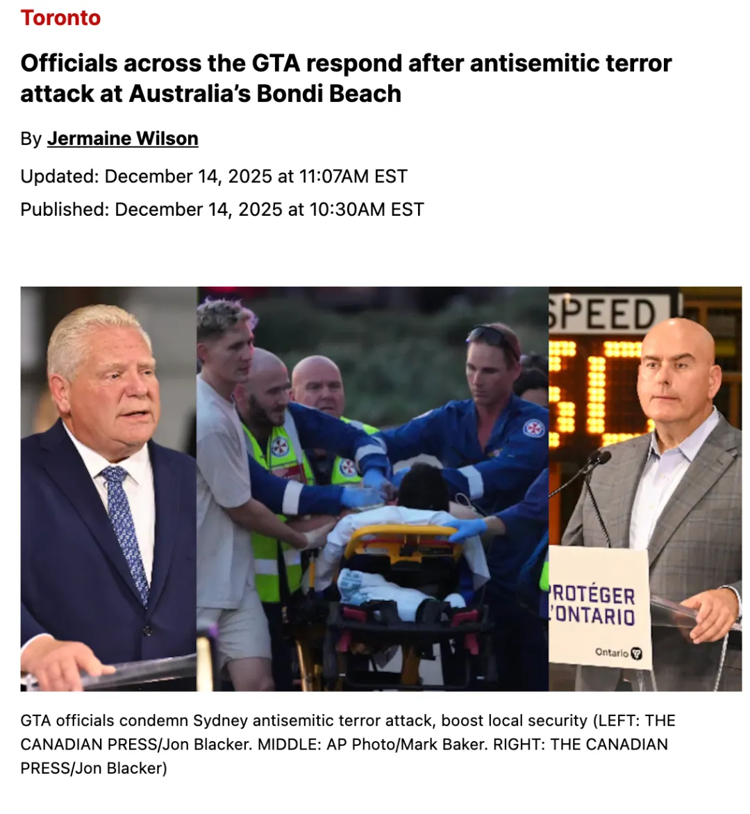 加拿大多位官员对澳大利亚悉尼邦迪海滩(Bondi Beach)发生的大规模枪击事件表示强烈谴责。澳大利亚当局已将该事件定性为恐怖袭击。与此同时,本地警方表示,将加强对本地犹太社区周边的巡逻。 12月13日周日,在澳大利亚世界知名景点悉尼邦迪海滩(Bondi Beach)举行的一场犹太节日活动中,两名枪手开枪射击,至少11人死亡,20多人受伤。(此前有报道称至少12死,但最新警方发布消息为11死)。 截至14日午后,新南威尔士州卫生部长表示,死亡人数一夜之间从 12 人上升到 16 人,其中包括一名 12 岁的儿童。 他说,另有三名儿童正在医院接受治疗。 目前尚不清楚死亡人数是否包括一名嫌疑枪手。 澳大利亚警方已将此次枪击事件定性为恐怖袭击,并正在调查是否有其他人参与其中。 当局表示,一名疑似枪手已死亡,另一人情况危急。新南威尔士州警察局局长 Mal Lanyon 在与新南威尔士州州长 Chris Minns 共同举行的新闻发布会上确认,一名警官也在事件中身亡,另有一名警官受伤。 “我们将不遗余力地彻查此案,”Lanyon 说。“这种暴力行为、夺走无辜生命的行为,是新南威尔士州绝不能接受的。” 当时,数百人聚集在邦迪海滩,参加名为 “Chanukah by the Sea” 的活动,该活动是为庆祝犹太节日光明节(Hanukkah)的开始。 警方表示,他们的行动“仍在进行中”,并称在事发地点附近发现了“多件可疑物品”,目前正由专业人员进行检查。 目击者称,这起发生在这处著名海滩、炎热夏夜中的枪击事件持续了大约10分钟,迫使海滩上的人们四散奔逃,冲向沙滩沿线及附近街道和公园。 周日,悉尼邦迪海滩枪击事件后,一名男子被抬上担架。(Mark Baker / 美联社) 来自墨尔本的 Lachlan Moran当时正在附近等家人。他告诉美联社,自己听到枪声后,放下了手中给弟弟拿的啤酒就开始逃跑。 “我听到几声爆响,我当时吓坏了,直接跑了……开始全力冲刺。就是那种直觉你知道吧,我拼命地跑。”Moran 说。他表示,自己断断续续听到枪声持续了大约五分钟。 “所有人都丢下了自己的东西,拼命逃跑,有人在哭,真的太可怕了。”他说。 紧急服务人员于晚上6点45分左右接到报警,赶往 Campbell Parade,当时有人报告称听到枪声。 当地媒体采访了多名情绪崩溃、身上带血的目击者。新南威尔士州州长 Chris Minns 表示,来自现场的报道和画面“令人极度痛心”。 澳大利亚总理 Anthony Albanese 表示,这起枪击事件是“在光明节第一天、原本应是欢乐和信仰庆祝日,对犹太裔澳大利亚人的一次有针对性的袭击——这是反犹主义的恐怖行为,击中了我们国家的心脏。” Albanese 是在与澳大利亚联邦警察助理专员 Nigel Ryan 一同对记者讲话时作出上述表态的。 “对犹太裔澳大利亚人的攻击,就是对所有澳大利亚人的攻击。”Albanese 说。“今天释放出的暴力令人难以理解,今晚这些家庭所承受的创伤和损失,远远超出任何人最可怕的噩梦。” 作为世界上最著名的海滩之一,邦迪海滩通常挤满了当地居民和游客。 居住在邦迪海滩一家青年旅社的加拿大人 Riley Stranaghan 当时正和一位朋友在海滩上,二人听到了枪声。 “我对他说,‘不,那不是烟花,那是枪声’,然后所有人都开始从海滩上狂奔离开,我们也一样,一直跑、一直跑。”他告诉 CBC News。 Stranaghan 最终在一名陌生人的公寓中躲避了几个小时。 “我只记得沿街奔跑,看到孩子在哭,家庭在逃跑。”他说,“太可怕了。” 加拿大总理卡尼在社交平台 X 上对枪击事件作出回应。 “对今天在澳大利亚邦迪海滩光明节活动中夺走12条生命的恐怖袭击感到震惊。”卡尼写道。 “加拿大与澳大利亚人民以及世界各地的犹太人站在一起,怀着悲痛,同时坚定决心,永不向恐怖主义、暴力、仇恨和恐吓低头。” 安省省长福特(Doug Ford)表示,这起袭击的影响远远超出了澳大利亚的国界,尤其是在犹太家庭正聚集庆祝光明节开始之际。 “在光明节开始之时,今天早些时候悉尼发生的可怕袭击之后,我的思念与澳大利亚、安省以及世界各地的犹太社区同在。”Ford 说。 就在刚刚,多伦多市长 邹至蕙(Olivia Chow)表示,这起袭击加剧了本地及全球犹太社区的恐惧感,并确认全市各地的犹太会堂和社区中心周边已加强警力部署。 “在邦迪海滩发生这起可怕的恐怖袭击之后,我的心与澳大利亚、多伦多以及世界各地的犹太社区同在。”Chow 说,并补充表示,犹太居民“有权在我们的城市中自由、公开且安全地生活。”     皮尔区警方(Peel Regional Police) 在社交媒体上表示,居民今天可以预计在宗教场所周边看到更多警力,并强调:“每一个人都应当感到安全、被尊重、被支持。没有例外。”  旺市(Vaughan)市长也提及了本地安全措施。市长 Steven Del Duca 表示,他已与 York Regional Police 取得联系,并预计将在未来几天与本市犹太社区成员共度光明节。 “当我们的犹太居民准备迎接光明节的开始时,来自澳大利亚的可怕消息让我们心情沉重——12名无辜者在一次残忍的恐怖袭击中遇害。”Del Duca 说。 “今天早上我已与约克区警队取得联系。一如既往,他们正在采取一切预防措施,确保居民的安全。”  “我也期待今天以及接下来几天,与旺市犹太社区的许多人一起庆祝光明节。”  约克区警方(York Regional Police)发布社区通告称,澳大利亚发生的暴力事件已在大多伦多本地产生影响,警方将在光明节庆祝期间提