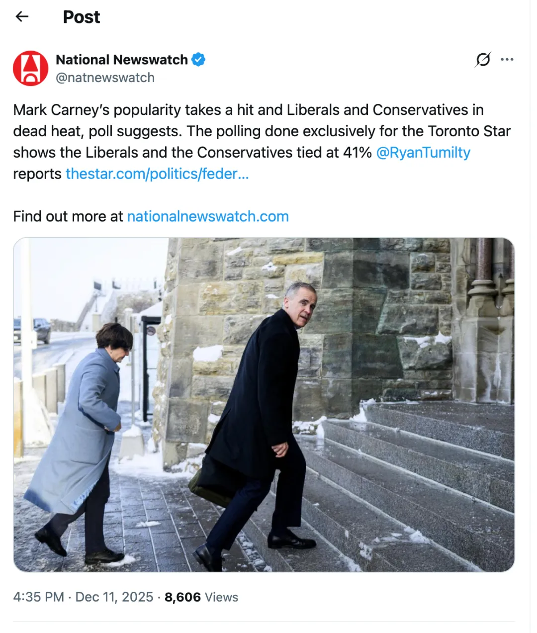 加媒最新报道,根据 Abacus Data 最新民调,尽管自由党与保守党依旧势均力敌,但总理 Mark Carney 的个人支持度首次出现明显下滑。  这份为《多伦多星报》独家完成的民调显示,自由党与保守党目前均为 41%,新民主党以 9% 远远落后,而绿党为 2%。   在魁北克省,魁人政团(Bloc Québécois)获得 30% 支持率,排在第二;自由党则以 37% 领先。在安大略省,自由党支持率为 45%,保守党为 44%,新民主党为 7%。   民调显示,各党派整体数据自今年春季大选以来几乎没有变化。Abacus CEO David Coletto 表示,选民主要根据他们最关心的议题来决定支持对象。   最关心日常生活成本的选民倾向保守党,而对美国总统 Donald Trump 和整体经济前景感到担忧的选民则选择 Carney 的自由党。   Coletto 指出,这种分化将让民调难以产生大幅度波动。“界线已经划定,无论是两位党领还是两党本身,都在各自支持的群体中拥有很强的吸引力,因此我们不该期待太多变化。”他说。   本次民调调查对象为 1,500 名选民,于 12 月 5 日至 9 日期间通过 Lucid 线上平台进行。此类自愿参与式调查无法像传统民调那样提供误差范围,但若以随机抽样估算,样本规模的误差约为 ±1.5 个百分点(19 次中有 20 次准确)。   Carney 的个人支持度是本次民调中少数出现变动的指标之一:对他持负面看法的加拿大人增加 4 个百分点至 35%,正面看法则为 45%。 这让他的净好感度为 +10%。相比之下,保守党领袖 Pierre Poilievre 的净好感度为 –5%。   Coletto 表示,Carney 的个人受欢迎度一直是自由党保持领先的重要因素,不过未来一年可能会改变这种状况。   “他从踏入政坛以来一直享有正净值的好感度,我认为 2026 年将会检验他能否维持这一点。”Coletto 说。   调查采样时间落在 12 月第一周,也就是联邦预算和 Carney 与阿尔伯塔省政府签署能源协议之后。 Coletto 表示,任何重大动作都伴随风险。“总理越是尝试推动重大议程,初期反应就越可能引发摩擦,让部分选民感到反感。”   他表示,Carney 的个人受欢迎度加上自由党在部分地区的强劲表现,意味着若今天举行大选,自由党可能仍能赢得组阁权。但他也警告,个人支持度下滑会成为严重隐患。   “一旦人们对Carney失去信任,他们就放弃了整个政府。”他说,“我仍然认为,即便在这样的数据下,自由党依旧是热门,但也不能低估保守党。”