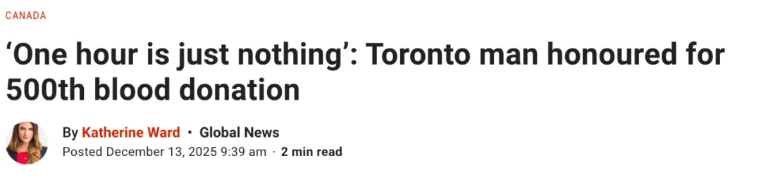 12 月可能是一年中最忙碌的月份之一。  要应付的事情实在太多了——工作、明显增多的家庭活动、购物清单,还有反复核对自己的待办事项。  向 Canadian Blood Services(加拿大血液服务机构) 捐血,或许并不是优先事项,但社区发展经理 Sharon Schaab 希望大家能重新考虑这一点。 “尤其是 12 月的最后两周,对我们来说是非常困难的一个时期,因为大家都忙着各种活动和假期,可能就不会把献血放在优先位置,”Schaab 说。“目前医院的血液库存还够用,但我们需要每天都有捐献者前来,才能维持一个稳定的供应。”  在未来五年内,Canadian Blood Services 预计对血液的需求将增加约 10%,而对免疫球蛋白(immunoglobulins)的需求将增加约 50%。  Nazir Jaffer 是多伦多东区一家捐献中心的常客。 他选择捐献血浆——这是人们每周都可以进行的一种捐献方式。“我所做的这项服务是在帮助病人,而病人是依赖我们的,”Jaffer 说。“整个过程大约需要一个小时。所以,一个小时真的不算什么,为了这种付出。”  本周,Jaffer 达成了一个令人难以置信的里程碑——累计捐献 500 次。现年 67 岁的他,早已将“回馈社会”融入日常生活,几乎从不缺席预约。    “这意味着一切。Nazir 在我们的捐献中心是一张非常熟悉的面孔,”Schaab 说。“他每周都会准时出现,从不缺席,还积极鼓励其他人。他和我们的团队、以及其他捐献者之间建立了非常深厚的联系。” 如此高频率的捐献,通常只有通过血浆捐献才能实现。人们也可以选择捐献全血或血小板。  “捐献血浆可以每周一次,这意味着一年可以捐 52 次。如果是捐献全血,男性每两个月才能捐一次,女性则每三个月才能捐一次,”Schaab 说。  Jaffer 希望,在这个节日季,每个人都能考虑至少进行一次捐献,帮助有需要的人。     “每次捐献结束后,我都会在离开前主动和别人聊天,问他们捐了多少次,”他说。“他们告诉我数字后,我就告诉他们我目前的捐献次数。他们就会说,你的数字太夸张了,我们根本追不上。我就告诉他们,不用担心,也不用想着要追上我。” 如今,Jaffer 又为自己设立了一个新目标——累计 1000 次捐献,同时鼓励更多人加入其中。