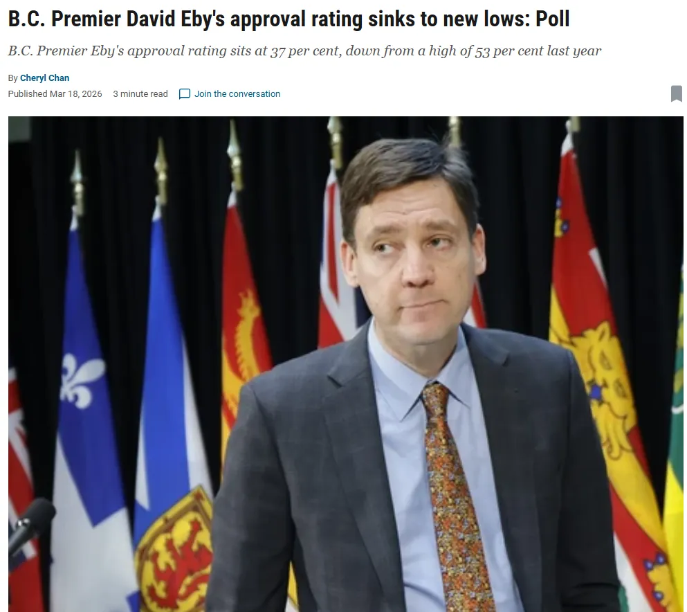 根据Angus Reid Institute最近的一项民调,卑诗省省长尹大卫(David Eby)的支持率已降至新低。 与去年三月相比,尹大卫的支持率下降了16个百分点。彼时,由于公开反对美国总统特朗普的关税及吞并威胁,许多省长受益于所谓的“特朗普加持”,尹大卫作为直言不讳的省长之一(与安大略省省长Doug Ford齐名),支持率曾创历史新高,达到53%。如今,这一数字已下降至37%,比去年12月下降3个百分点,使他在民调中的九位省长中排名第七。 政治分析师Shachi Kurl指出:“2024年10月,尹大卫和卑诗新民主党以微弱优势赢得选举。在随后的15个月里,几乎没有任何事件能提升该党的支持率——反而情况更糟。” Kurl表示,困扰卑诗居民的问题,包括生活成本、住房可负担性以及初级医疗服务获取困难,仍然困扰着政府。 此外,政府因处理原住民土地所有权问题而受到批评,包括近期Cowichan Tribes裁决引发的私人财产权不确定性,以及尹大卫在联邦-Musqueam协议签署仪式上声称不清楚协议细节的情况。她指出,这一和解问题在很大程度上是政府自身造成的:“只要卑诗居民相信通过《原住民权利宣言法案》(DRIPA)可以实现和解,多数人都是支持的。但最近的联邦和省级决定让卑诗居民充满了不确定性,而政府在此时缺乏答案,需要做大量解释。” 尹大卫政府上个月还因公布创纪录的133亿加元赤字以及在2026年预算中增加了不受欢迎的税收(如对某些服务征收PST)而受到批评。与此同时,卑诗保守党在前领袖罗仕德 (John Rustad) 被罢免后重新振作,正准备选举新领导人,这也使尹大卫的低支持率更为突出。 根据Innovative Research Group在预算公布后进行的民调,47%的已决定选民表示会投票给保守党,而39%的人表示会投票给新民主党(NDP)。另一份由Leger于今年2月(预算公布前)进行的民调显示,卑诗新民主党对保守党的领先优势从10个百分点缩小至6个百分点,越来越多的卑诗居民认为该省发展方向错误。 尹大卫的支持率为其自接替前省长贺谨 (John Horgan) 以来的最低值。自去年12月以来,尹大卫的支持率下降了3个百分点,与Doug Ford相同,而Ford的表现更糟,仅有31%的安大略居民认可他的工作。这一数字相比去年特朗普关税威胁高峰时期近70%的支持率,已下降超过一半。 相比之下,阿尔伯塔省长Danielle Smith的支持率自去年12月上涨2个百分点,达到46%,尽管阿尔伯塔省预算显示有94亿加元赤字。曼尼托巴省省长Wab Kinew在全国支持率中领先,达到61%。