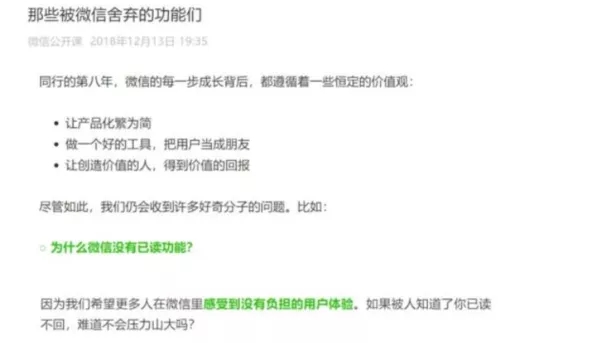 报导指出,早在2018年的“微信公开课”上,微信团队也曾阐述他们的设计理念,希望使用者在微信中,感受到的是“无负担的使用体验”。