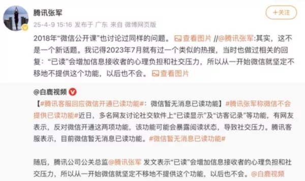 腾讯客服先前也回应过,“目前微信暂无讯息已读功能。”同时,腾讯公司公关总监张军也发文强调,这个话题先前曾回覆过了。