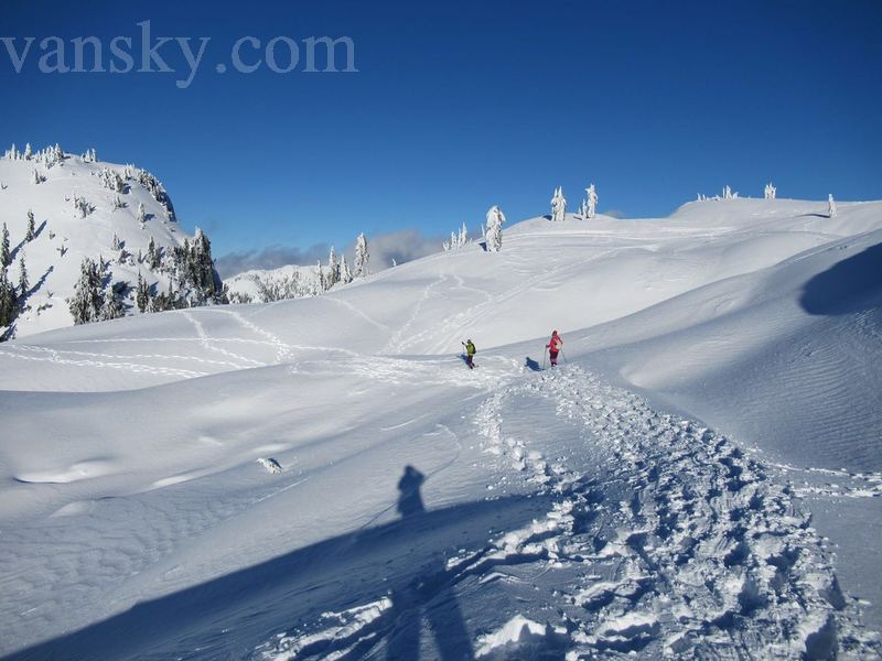 2019年1月7日,是大温哥华地区冬日少有的晴天。暖阳高照、风和日丽。精英徒步友的三位女士,Patricia, 津津和Rui Wang穿雪鞋,登上了白雪皑皑的西蒙山(Mountain Seymour)的一峰(First Peak or Pump Peak) 和二峰(Second Peak or Tim Jones Peak)。这两个峰是较难攀登的,尤其是一峰,最后100米,颇为陡峭,巍巍难行。