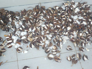 This photo was taken in rural China where I meet the cotton farmer above. Cotton is grown on a bush that needs to be picked, sorted, and cleaned so that the buds are ready for processing to yarn.