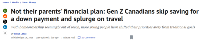 对许多年轻加拿大人来说,曾经朦胧的购房梦想,如今变成了巨大的经济负担。于是,他们正在重新排列财务优先级:不像上一代那样把买房和退休储蓄放在首位,而是选择为旅行和能带来满足感的体验存钱。