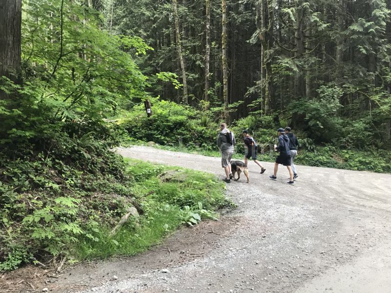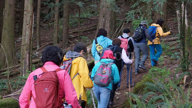 我们这支队伍,这次共12人,平均年龄50岁上下,号称精英徒步群。队长兼向导是一位有丰富远足经验的干练的Patricia女士,高级英文医学翻译。集合时间是9点半。届时大家都驱车到齐。人人基本都穿上了登山的装束、带上了相关的用具,包括熊喷。队长讲了一下要求,如见到熊,不要出声,全队井然后撤等,我们就出发了。在我们之前,有四位男青年和一条健狗,先我们而去。