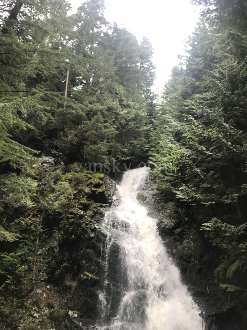 在中途,我们就看到有溪流奔跃而下,跳过巨岩、横木,飞着浪花,感到特别畅快。到了上面,无意发现其源头是一挺大的瀑布 (后来知道叫锯片瀑 Sawblade Fall)。水流奔跳跌荡,分几级跌落而下,最后一级,落差很大。水垂直而下,落在下面的潭中,水花腾起,激扬飞溅,声音轰然如擂鼓。在这林木幽深之处,别有一番景致。同时我还开玩笑说:回去的时候,顺流而下,将是捷径,而且不需寻路。我回来后,赋诗一首:
