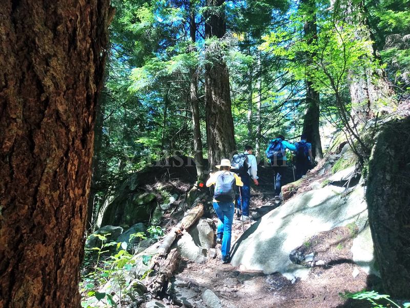 我们继续前行。这个山是起起伏伏的,刚过一坡,又来一岗,但高度也逐渐增加。路越走越窄,越往高走,越象是在丛林中行走。我们6个人,一个接一个地往上走,也常是神龙见首不见尾。