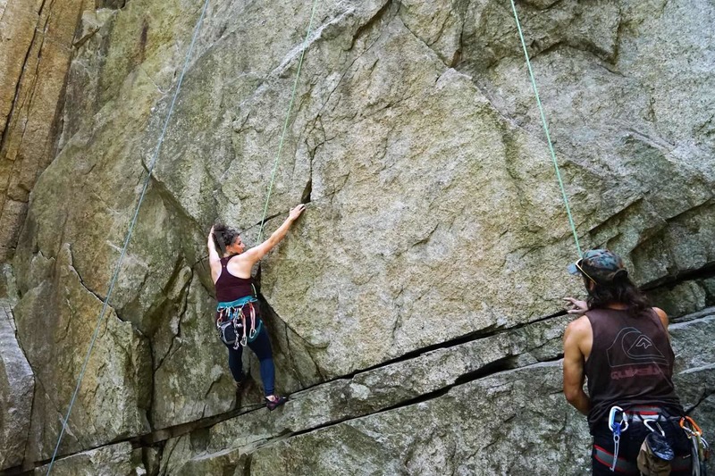 这样我们了解到:他们一开始攀,都是自由攀,特别是组里的第一个人,每攀到一个前人楔入的吊环处,就把自己的安全绳索的挂环挂上,防止失手、失脚时跌下来。每到一个楔入的吊环处都这么做,就这样,他们虽是自由攀爬,但是很安全。曼丽也问到,有没有发生过事故,他们说基本没有,除非由于粗心大意,在该锁定的地方没锁住。听到这些,我们也对他们的安全放了心。看到他们谨慎地、探索式地、十分有技巧地一步步上攀,迅速地拉着绳索下来 (攀岩只是徒手上,不徒手下,那样十分危险),配合紧密,我们十分欣赏,同时也体会到了这一运动的挑战性和刺激。