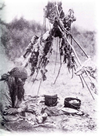 原住民的食品比较简单,多是靠山吃山,依水则索取水产。例如林地原住民猎人熟悉动物的栖息地和季节性迁徙特性,他们依靠动物来生存。一头水牛可以提供了很多肉,如公牛的平均体重约700公斤。 新鲜食用时,将肉加些水烤制,或者用热石块在皮袋中煮熟,这一过程可生成丰富而营养的汤。 与干牛肉一样常见的是肉干,可以长时间存放在生皮袋中。 妇女还将高蛋白质干肉捣成粉末,然后与受热融化的水牛脂肪和浆果混合。 猎人可以很方便地将这些有价值的食物放在一个小皮包里,较长时间保存并食用。