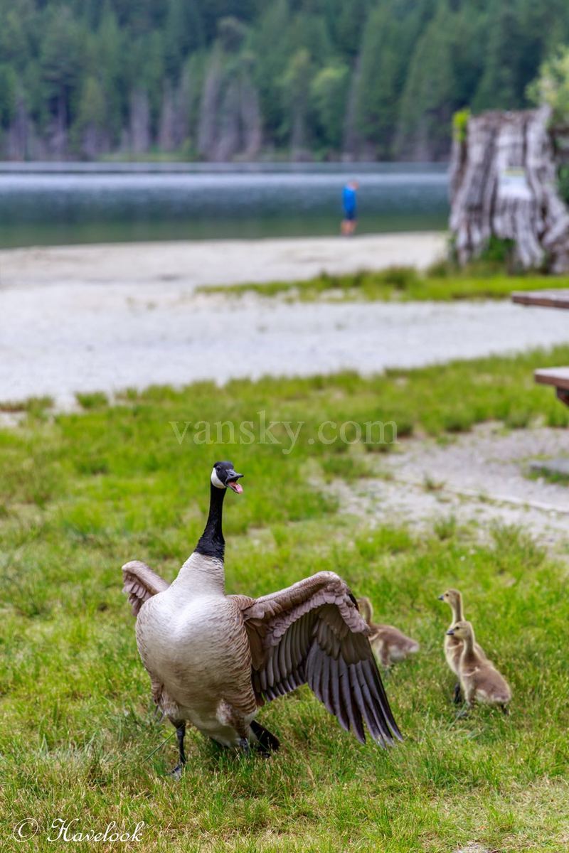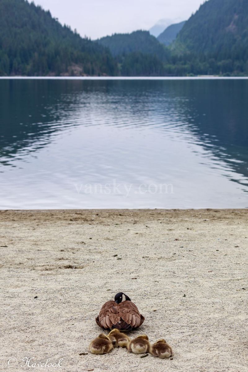 转过身来,我们就看到了一个动人的场面。只见两只鹅带着4只小鹅散步走来。4只毛绒绒的小鹅伸头缩脑,很可爱,当我们想接近小鹅时,一只大鹅,应该是公鹅, 不让了。先是金刚怒目,吱吱有声,接着耸起翅膀,一副拔刀相向的样子。无疑,他嬴了。我们离去了。小鹅继续欣然嬉戏,大鹅则大摇大摆地走在旁边。