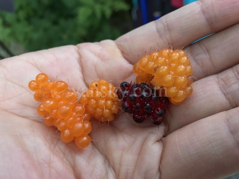 先是由平地走向大山,周围都是树棵矮丛。在BC水电局工作的龙山人对这很熟悉,推荐我们摘路边的鲑鱼莓,一吃,果然味道很好。一路上我们吃了不少。