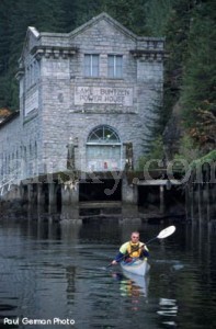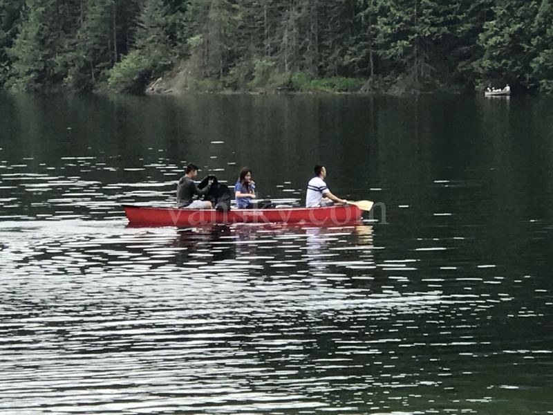 终于下到了底,走不远,就见到了本珍湖。霍然入目的是湖的闸门室,这是一个有100多年历史的十分坚固的水泥建筑。可惜看不到发电站,发电站在山下印第安肩(Indian Arm)的海边,从Deep Cove可以看到 。本珍湖高度为100米,开闸后,奔腾的水以巨大的势能推动在海平面上的发电站内的水轮机发电。