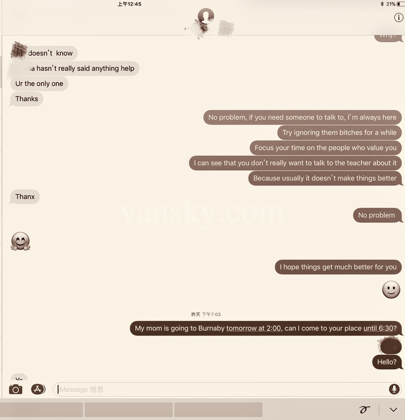 “我告诉她,‘No problem, if you need someone to talk to, I’m always here.Try ignoring them bitches for a while. Focus your time on the people who value you. I can see that you don’t really want to talk to the teacher about it. Because usually it doesn’t make things better. No problem. I hope things get much better for you.’ 大致的意思是,“没关系,如果你需要找人聊,我一直都很愿意听,试着慢慢忘记它,把时间花在值得你去关注的人身上,我知道你不想告诉老师,不认为这样做会让事情好转,没问题,我相信事情会慢慢好起来的。”