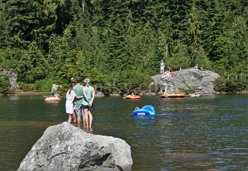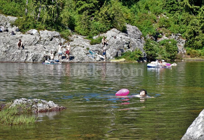 神秘湖在我们登山而上快到峰顶的一块巨岩的后面,形状有点圆,真是游泳的好地方。虽然7月中旬冰雪才全部消融,但一周后我们去时温度已经很适合游泳了。最妙的是,它岸边的巨岩可以跳水,水中的岩块可以休憩。岸上、水上人都很多。船在水中游弋,人在船间穿梭,跳水的浪花时时溅起。从Patricia她们上来的路上,游人络绎而至。