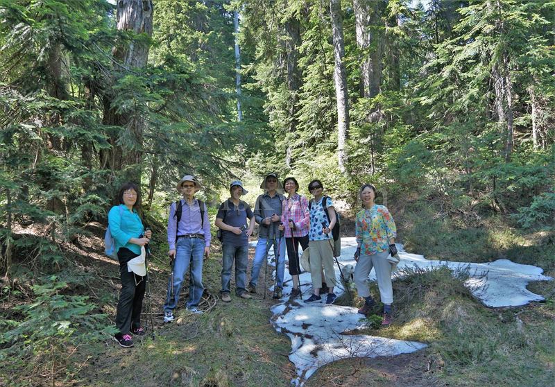 快走到山顶的时候,在几处树阴风凉之处, 残雪居然莹莹一遍。我们在这盛夏的七月雪中照了相。