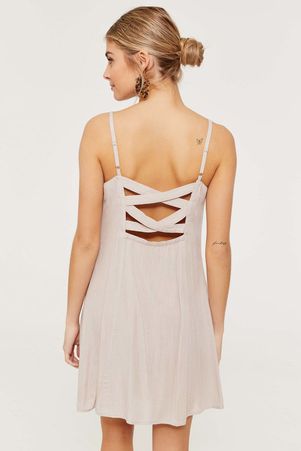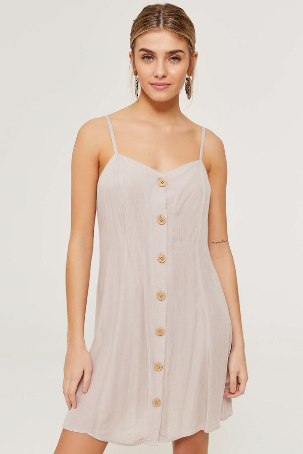 Woven mini a-line dress. Thin adjustable straps. Sweetheart neckline. Button front. Caged back. 100% viscose. Model is wearing size S.