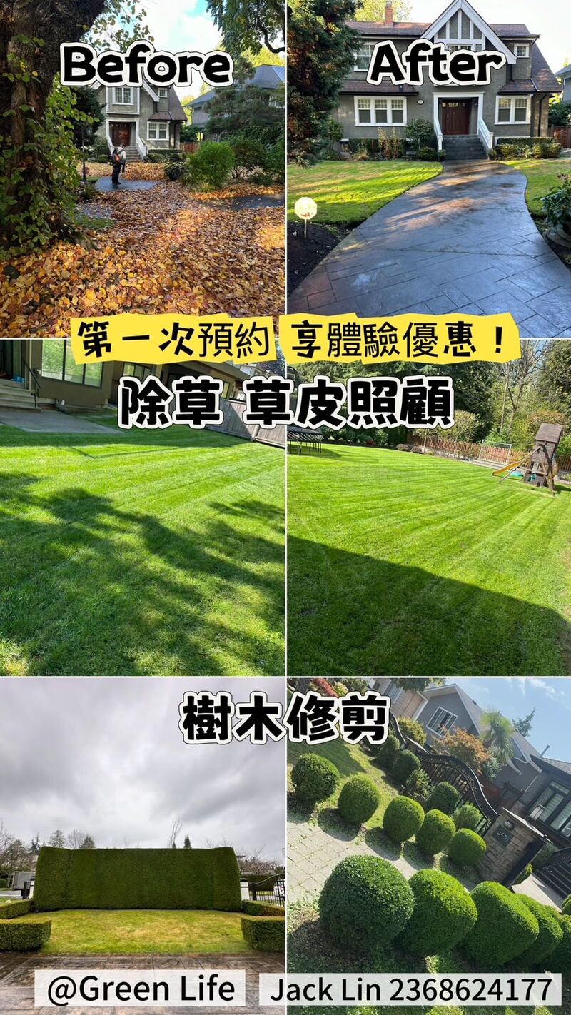 本人可以开工作车和各位老板一起去剪草修树清落叶,自备一套园艺设备,只要需要即可开工!价格实惠!非诚勿扰!